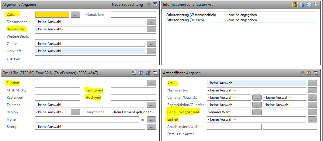 Das LfU bittet um Ausfüllen folgender Pflichtfelder: Datum, Beobachter, Fundortname und -koordinaten, Art, Genauigkeit, Anzahl, Einheit